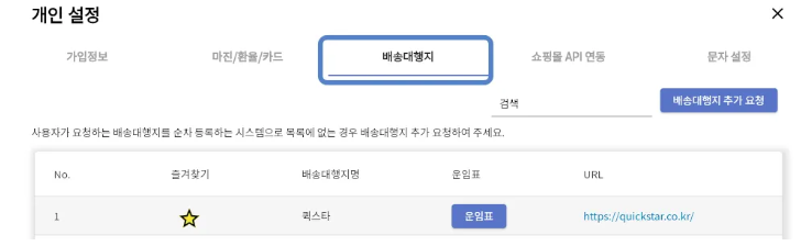 [개인설정] – [배송대행지]에서 사용하는 배송대행지를 즐겨찾기로 등록합니다.