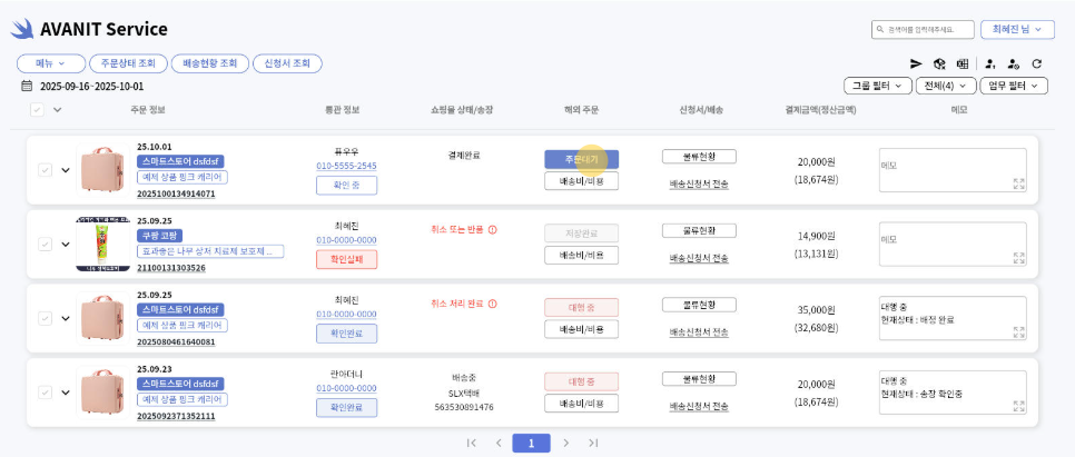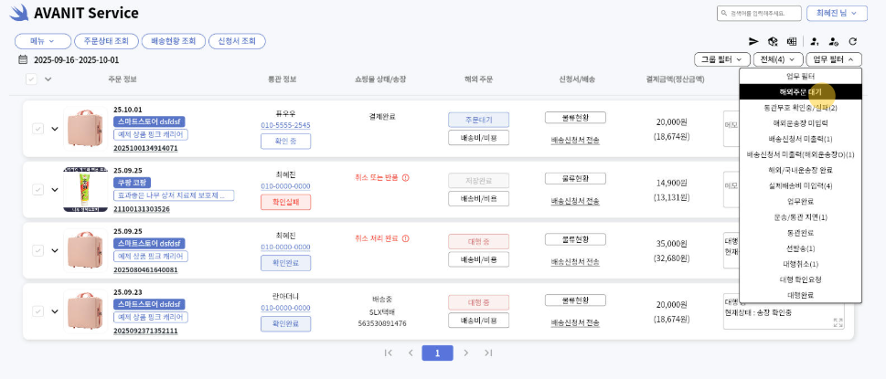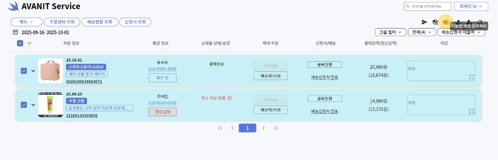 • 상단 ‘신청서조회’ 버튼을 누르면 신청서 상태(입고완료, 오류입고 등)를 업데이트 할 수 있으며, 배송비가 최종 결정된 경우 배송비가 아바닛에 입력됩니다. 정기적으로 처리하시는 것을 추천드립니다.