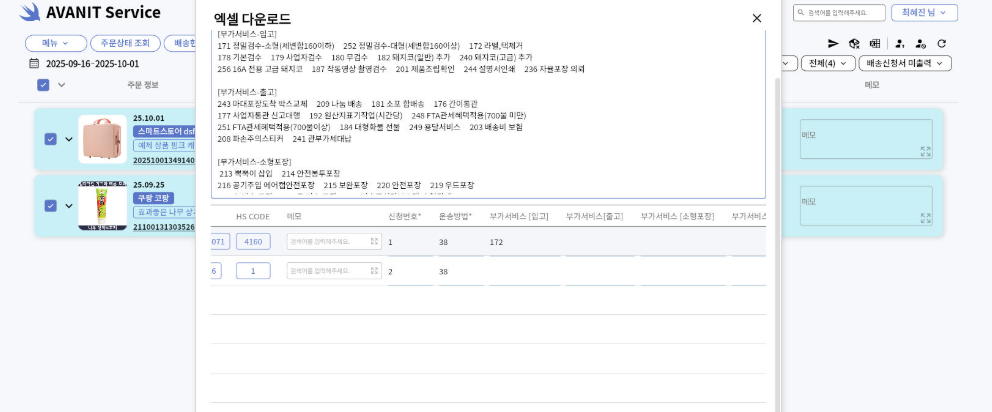 위 목록에서 입출고 포장옵션 등 서비스 번호를 확인하고 표에 넣어주세요.