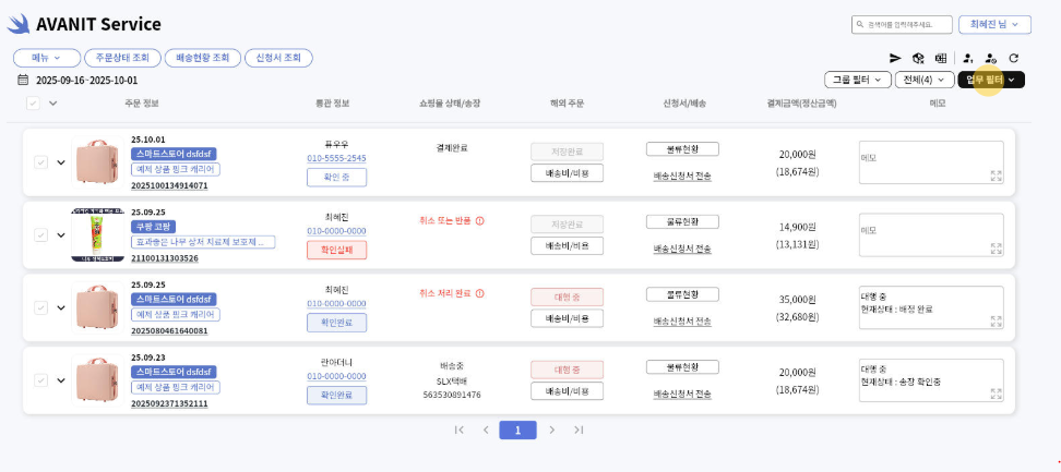 업무필터를 [배송신청서 미출력]으로 이동하여 주세요.