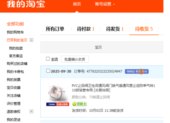 타오바오에서 제품을 주문한 뒤, 주문내역 페이지로 이동 해 [아바닛 주문 복사]를 누른 후,