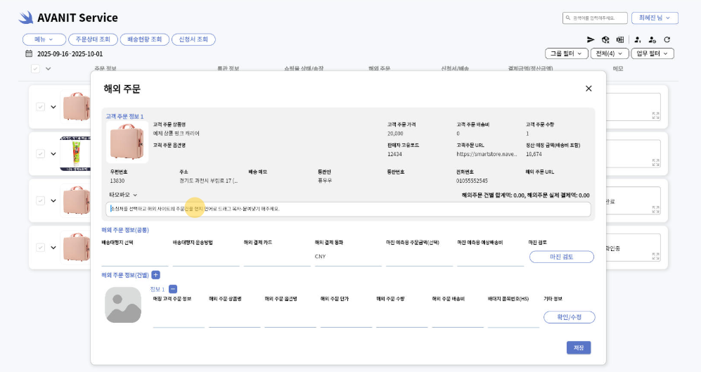 • 최초 신청서 작성 시점에 해외송장번호가 없는 경우, 해당 주문건 펼쳐서 해외 송장번호를 아바닛에 입력하면, 해당 정보가 배대지로 입력됩니다. (아바닛 확장프로그램으로 자동 입력된 송장은 자동 전송되지 않으니, 해외송장부분을 한번 눌러서 전송해주세요. 누르면 팝업이 뜨면서 전송됩니다)