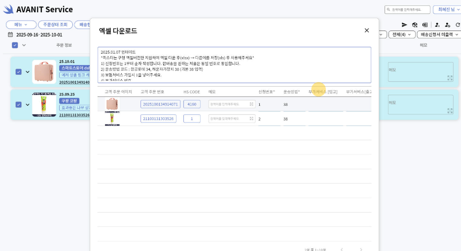 • 전송시 배대지에서 해당 신청서 건에 부여된 국내 택배사 / 송장번호가 아바닛에 자동 입력됩니다.