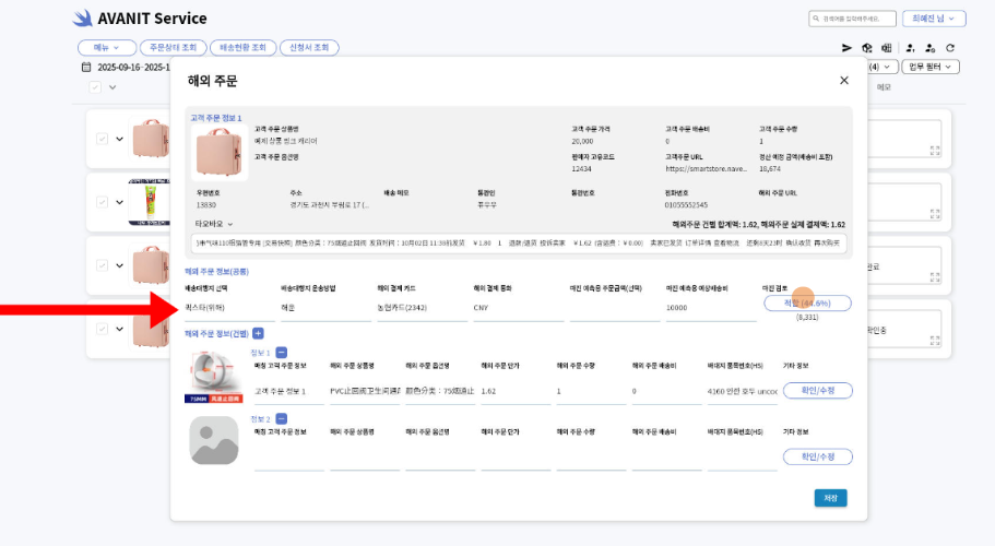 배송대행지, 운송방법, 카드, 예상배송비, 고객주문정보, 품목번호 기입 후 마진 검토를 눌러주세요.