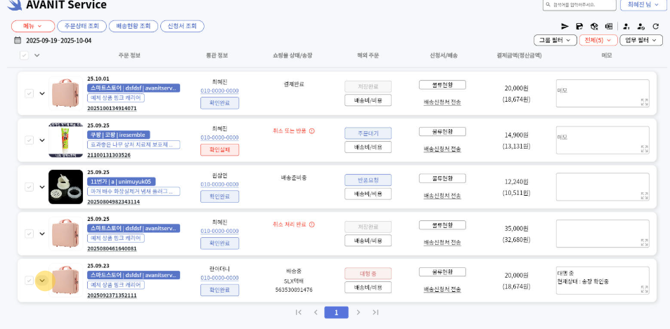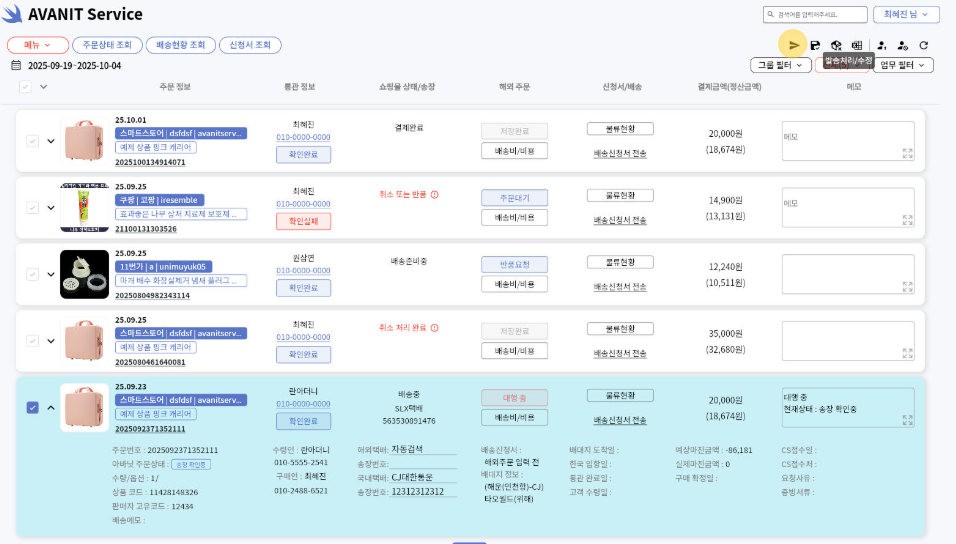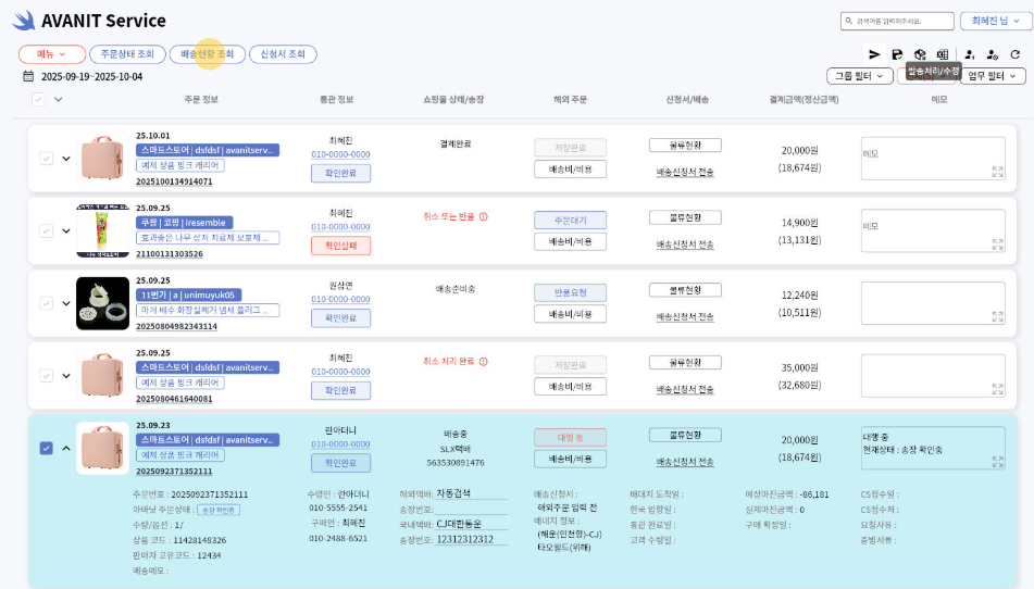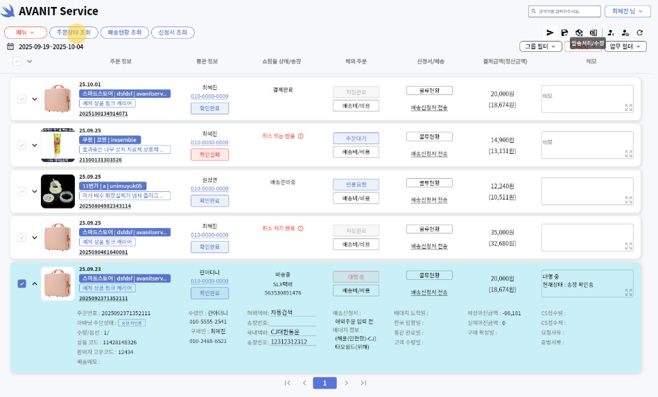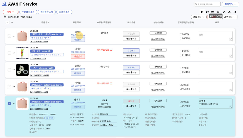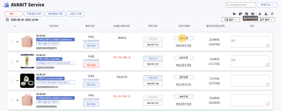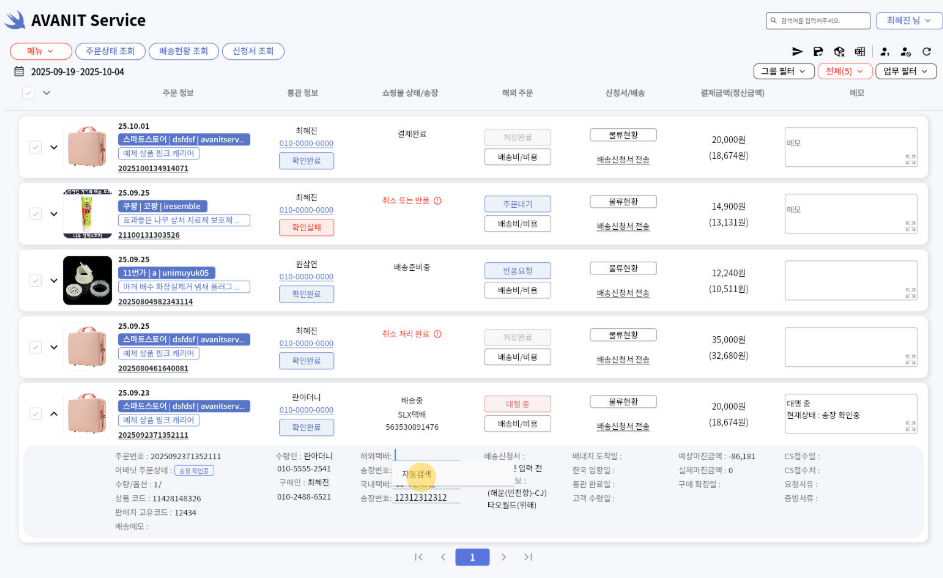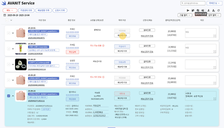 1시간 간격으로 반품/교환/취소(CS) 접수는 아바닛에서 자동 확인되요.