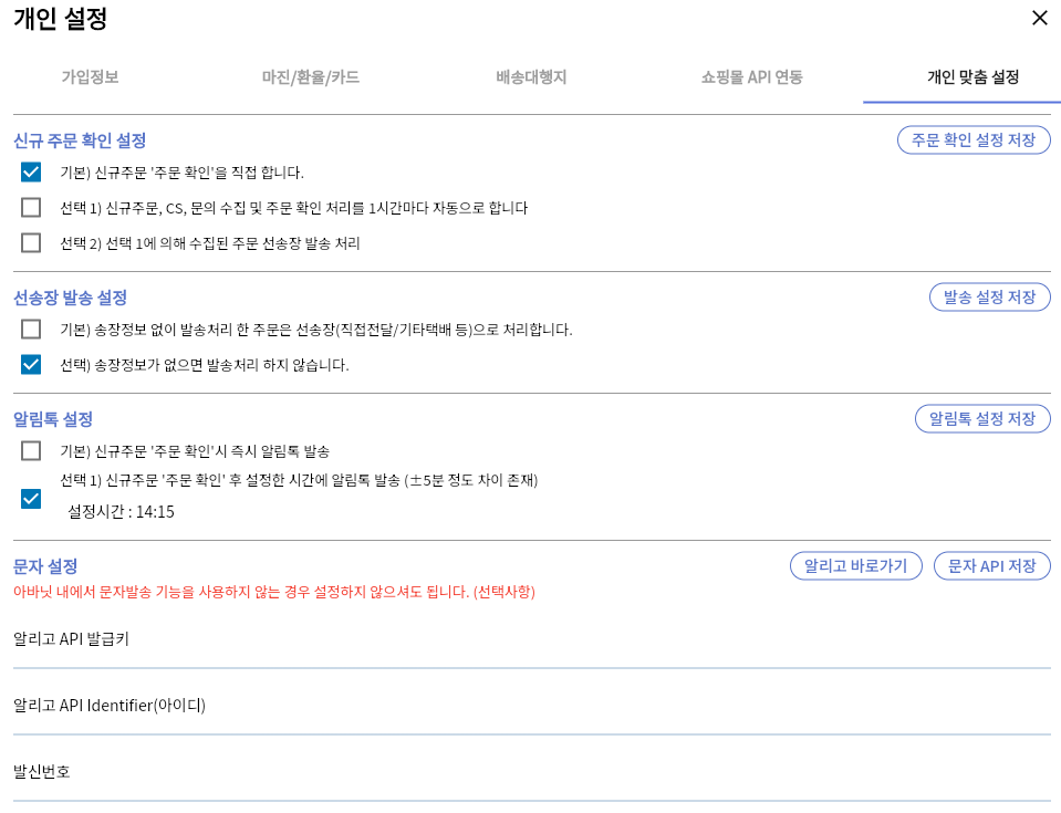 ⇒ 1시간마다 설정시 신규주문 알림 기능을 이용할수 있습니다. (신규주문시 알림)