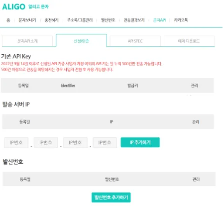①알리고 사이트 접속(클릭) → ② 가입 및 충전 ③ 문자 API-신청/인증화면 접속 후, API 키, 발송서버 IP, 발신번호 등록하시고 아바닛에도 등록해주세요.