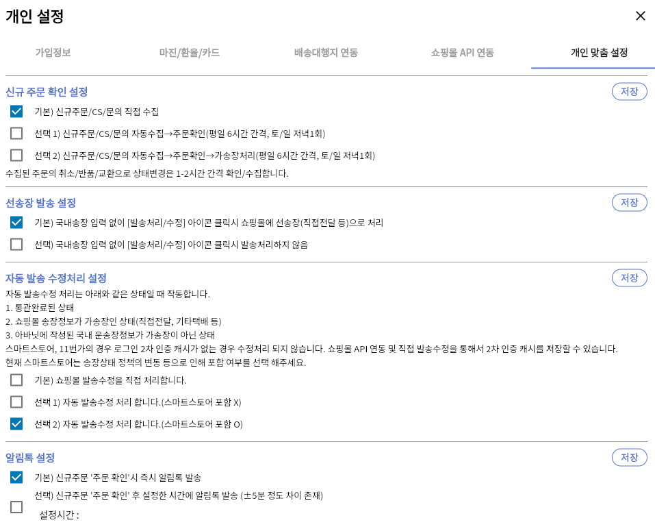 주문 수집 주기, 알림톡 발송 방식, 송장 자동 수정 여부 등을 설정해 반복 업무를 최소화할 수 있어요.