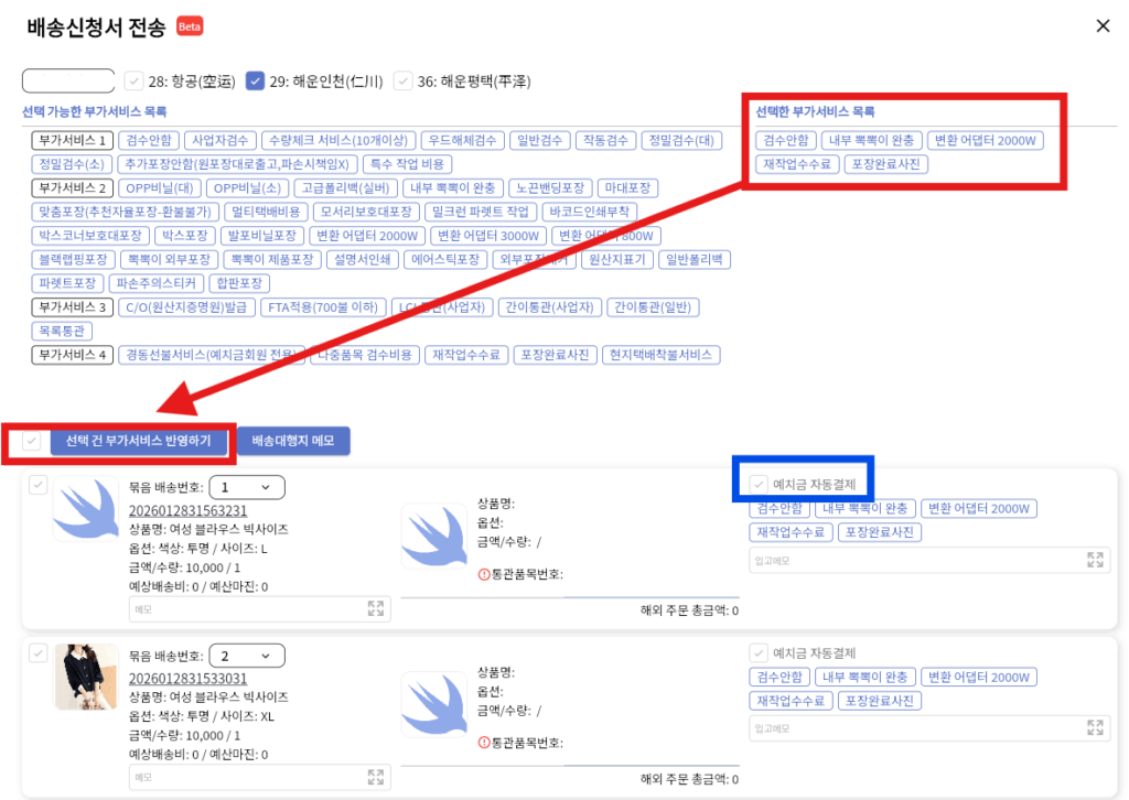 배송 신청서 작성이 불필요한 소싱 사이트의 주문 건인 경우에는
