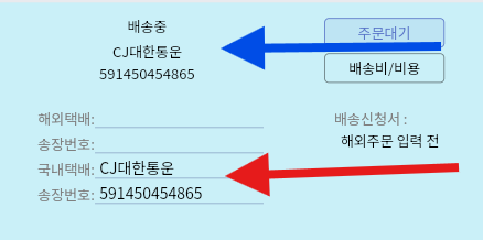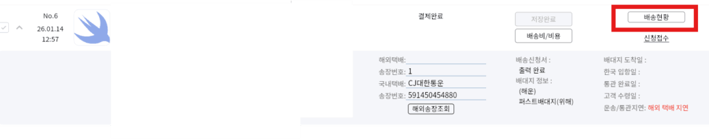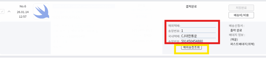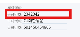 붉은색 영역에 해외 송장번호 또는 국내 송장번호를 입력하면