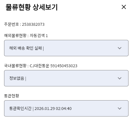 해당 주문의 물류 및 통관 상세 현황을 확인할 수 있습니다.