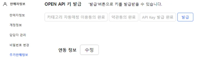 ② [판매자정보]- [추가판매정보]로 접속 → API키 발급 선택