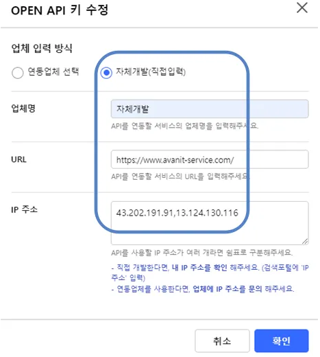③ 업체 입력 방식 [자체개발] 업체명 [아바닛] URL [쿠팡링크 혹은 아바닛 사이트 주소] 작성 → 당사 IP 주소 입력