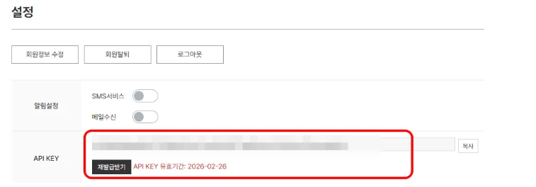 마이페이지 하단에서 ‘설정’ 클릭하면 API를 생성할 수 있습니다.