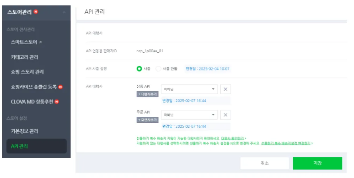 ① 스마트스토어(클릭시 이동) 에 접속 → 스토어 설정 – API 관리에서 API 설정 [사용]으로 변경 →